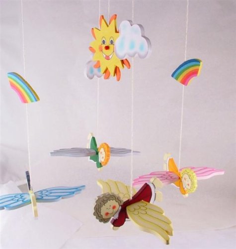Delightful nursery mobile with angels amongst rainbows sun and clouds. Measures approximately 33 by 21 cms.