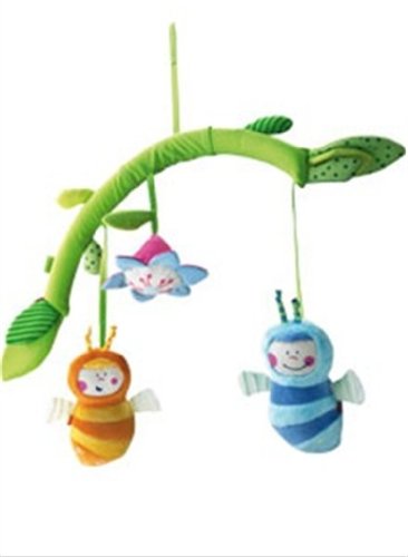 These two cute little chaps will undoubtedly help babies fall asleep. The stripes on the wings, the faces and the flower shine in the dark. The fireflies are fixed by magnets and can be taken off so that your child can hold them in his hand while falling asleep. If you press or shake them they twitter or tinkle. Material: cotton/polyester Dimensions: W: 55 x H50 cm Age: 0+ learning skills Sensory . Social/Emotional . Independent Play