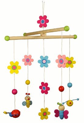 Beautiful Garden mobile in bright colours, featuring butterfly, bee, ladybird, caterpillar and flowers. This cheerful mobile will bring a smile to your child's face. This is a nursery mobile which has a string loop to hang from a ceiling hook and therefore can entertain your baby longer than a mobile that fixes to the cot and must be removed when the baby can sit up. Size: hanger 30cm wide. Safety: Mobiles are for decoration only and are not intended for use by children as toys. Please ensure for safety's sake you keep your mobile out of baby's reach. .