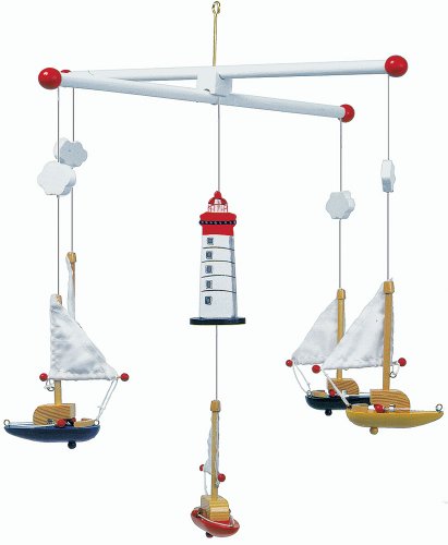 A gorgeous hand painted wooden mobile, sailboats and lighthouse complete with puffy little clouds - an absolute delight.